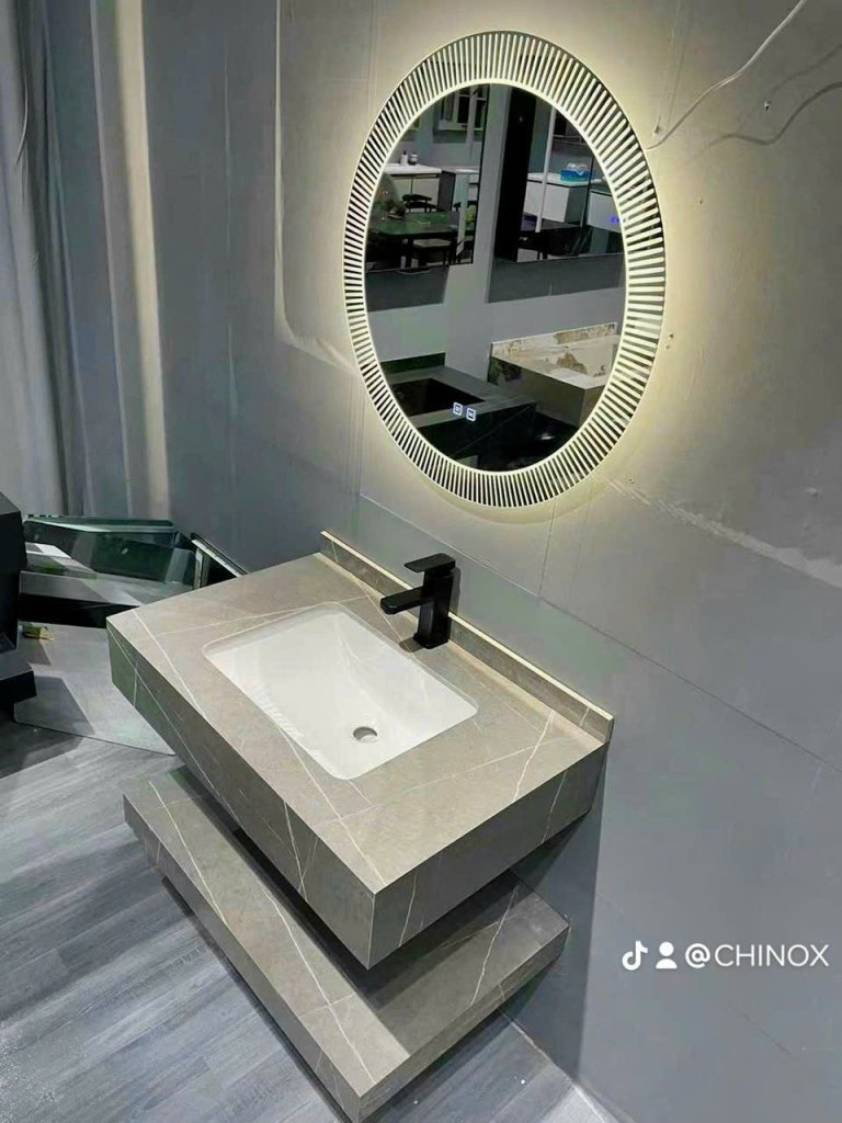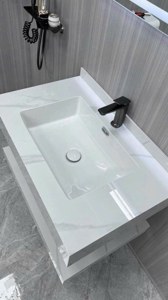 Bàn đá 2 tầng, tầng trên kèm chậu tràn viền, tầng dưới là bàn để đồ, đủ giá đỡ đi kèm, có 3 màu: Trắng, Đen, Ghi