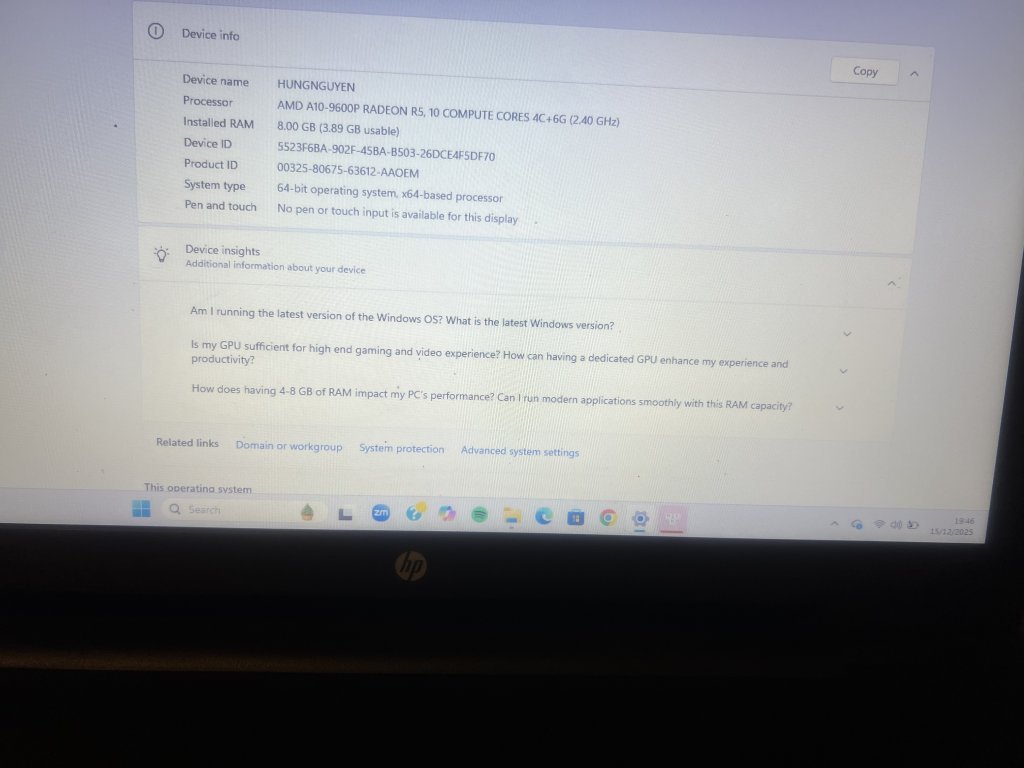 1 Lap HP cấu hình như ảnh chụp, màn 15.6in, máy này e được cho, đã bị bóc hết tem nên ko biết tên máy. Pin kém. Dùng học tập, vp đều ổn. E bán 2tr5