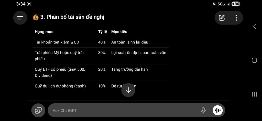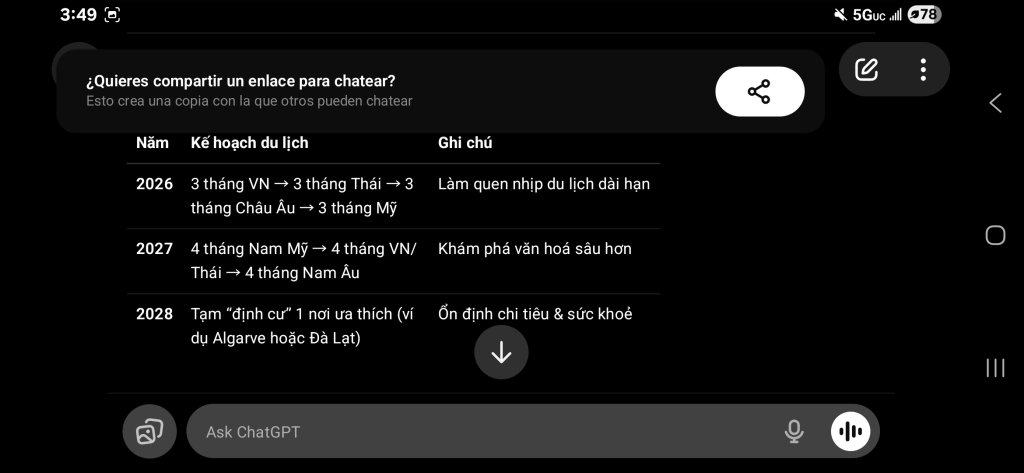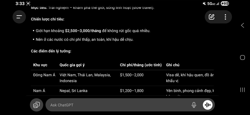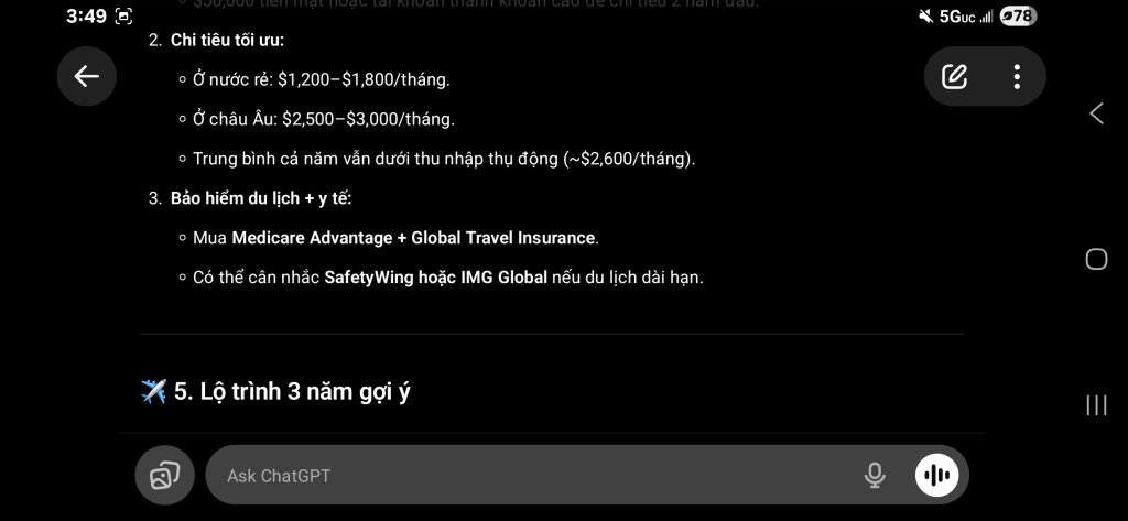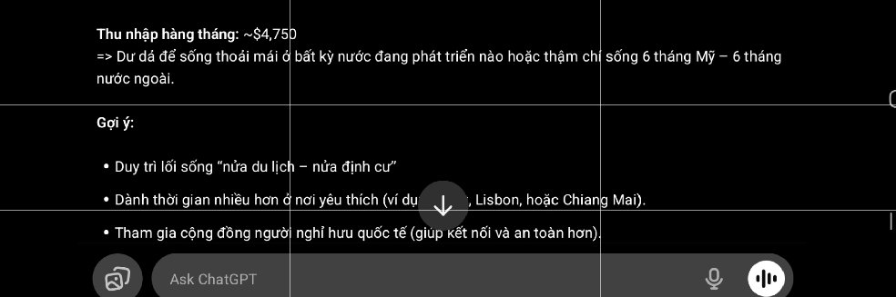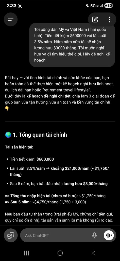 Em vừa đi chơi nước ngoài mới về, còn lạ múi giờ khó ngủ, nằm bấm phone hỏi ChatGTP về kế hoạch nghỉ hưu thì nhận được kết quả và gợi ý như sau. Cũng không tệ lắm, nhưng cũng chưa đủ sức mạnh khiến em nghỉ việc ngay ngày mai. Có lẽ em vẫn còn chưa chán công việc và vẫn còn tham tiền lương.