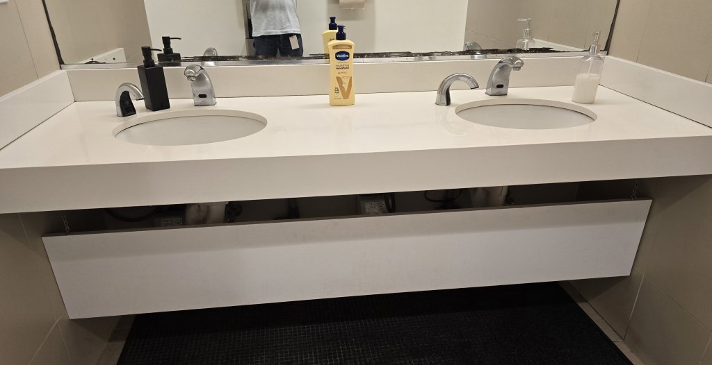 Bồn rửa tay cũng là không chạm, vòi nước dùng cảm biến, giấy lau tay cũng cảm biến.
