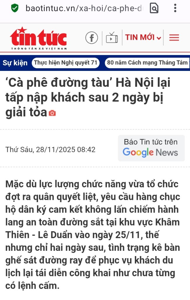 Kk thế thì người đâu mà làm chủ tịt cho xuể hả cụNếu quyết làm thì nên đưa vào KPI của chủ tịt phường là xong, cứ phường nào còn lấn chiếm vỉa hè là cho về vườn ngay và luôn. Chứ cứ hô hào vài bữa như bắt cóc bỏ đĩa, đầu voi đuôi chuột trăm năm nữa vẫn câu chuyện cũ.