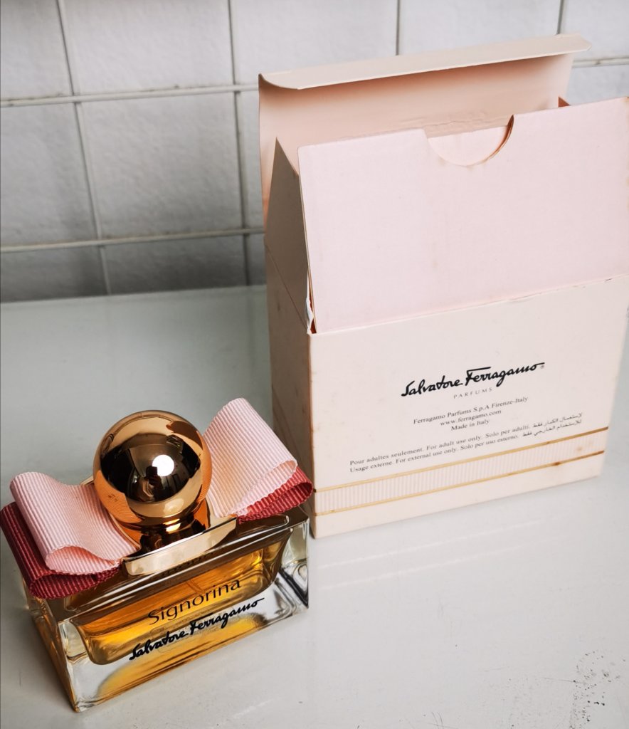 1. Chai nước hoa Salvatore Ferragamo Signorina 30ml của gấu nhà em. Xịt thử 1 lần duy nhất rồi không dùng vì nói không hợp mùi. Em thấy mùi rất thơm, quý phái, phù hợp cho nữ từ 30 tuổi trở lên. Em để 500k