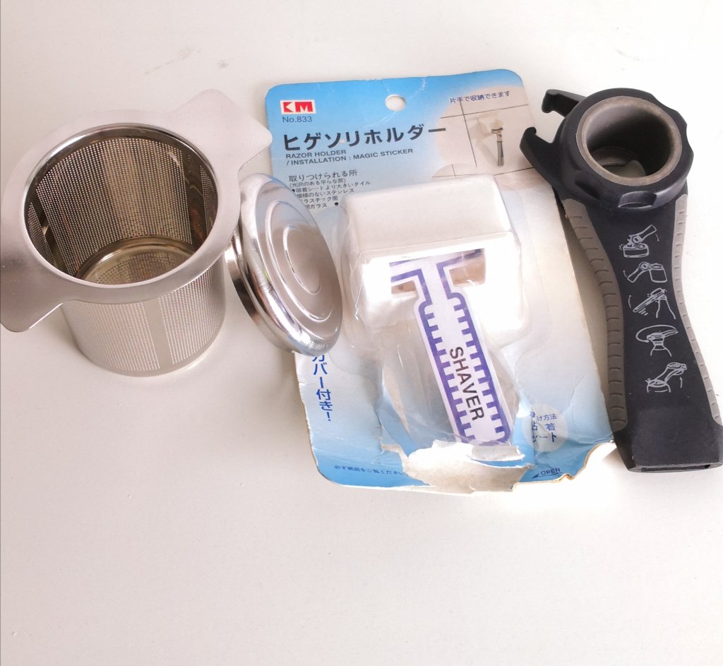 7. Lọc trà/caffee bằng inox + móc treo dao cạo râu + mở bia 5 trong 1 = 50k (Chưa sử dụng)