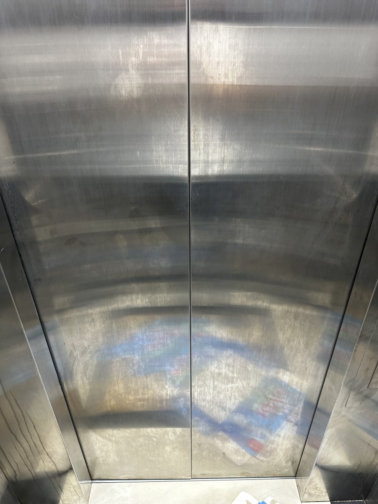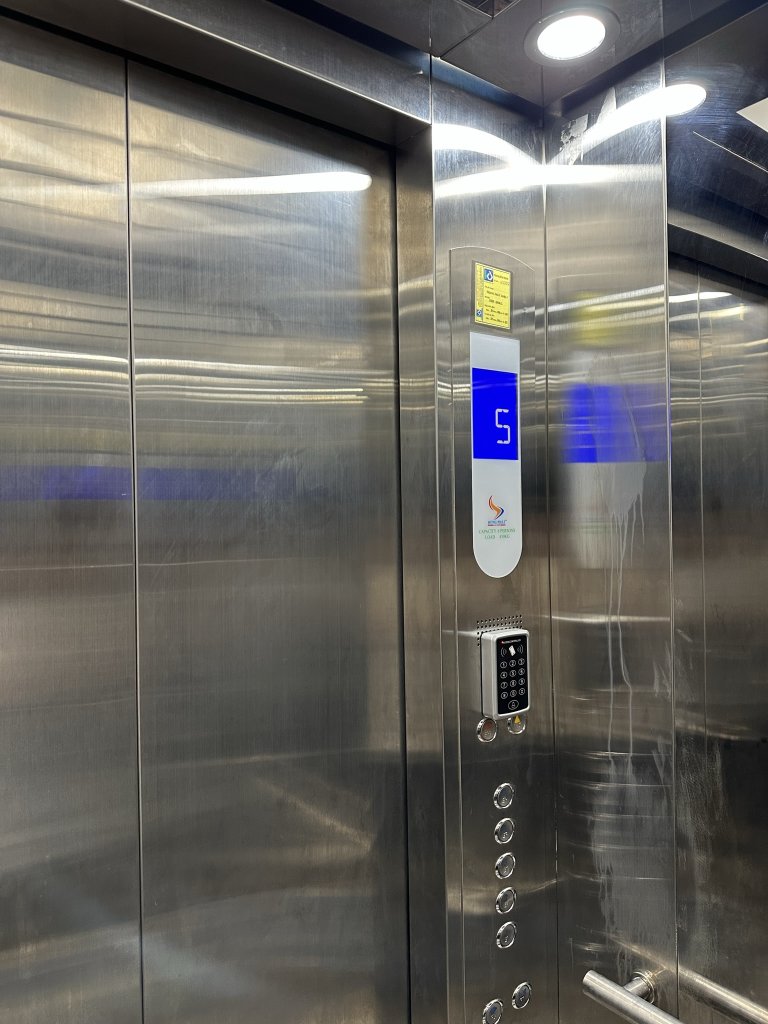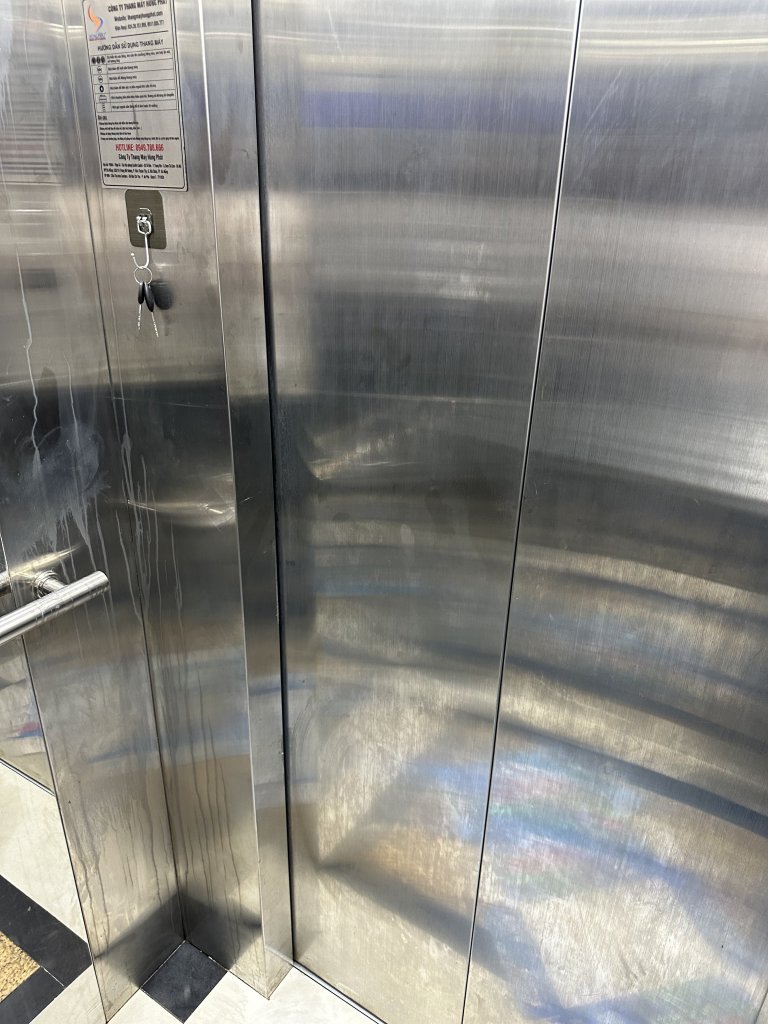 Trang trí thang máy cho cụ Huy, do mới bàn giao đưa vào sử dụng chưa được bao lâu đã xước nhiều và dễ bám bẩn, để lại vân tay: