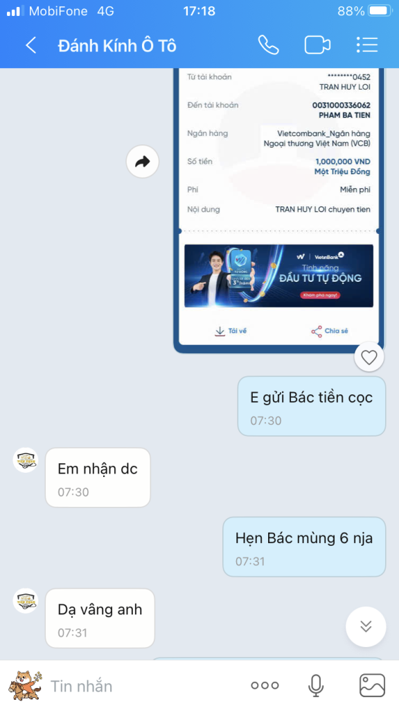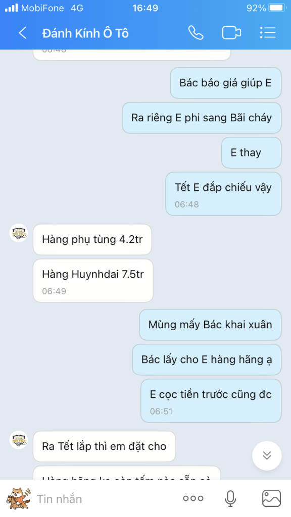 E ở Tỉnh mà Cụ. Nhưng ko kịp thay Cụ ạ. May mà có xưởng hẹn 6 thay cho ấy Cụ. E ngắt mát bình điện rồi Cụ ạVâng cụ, hôm nay thì vẫn kịp, cố gắng thay tối nay để keo khô một đêm mai yên tâm luôn. Chính ra ở tỉnh tầm nay thay nhanh hơn ở HN, tầm này HN thợ nghỉ hết rồi hơi khó.