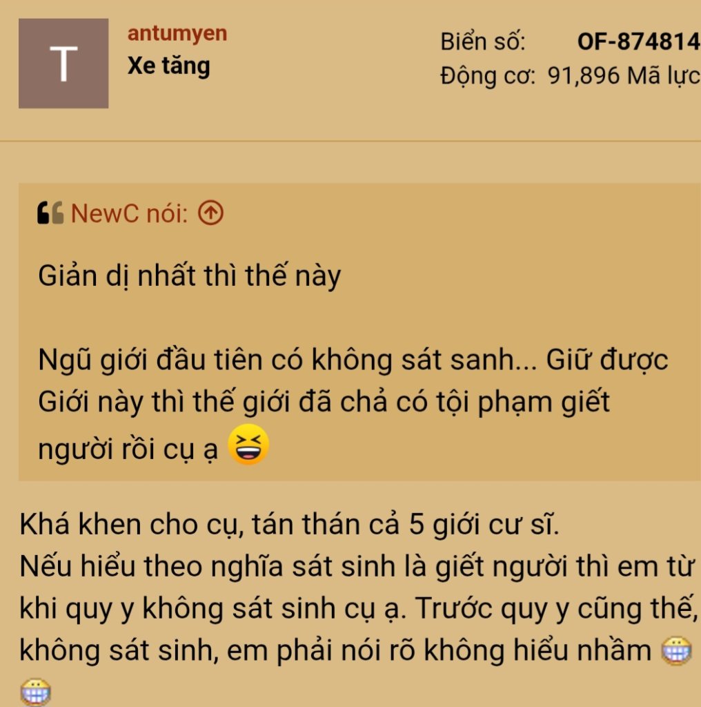 Bạn đã quy y rồi thật dáng quý và tiếp tục tu học theo ngài Duy Ma Cật. Xin hỏi bạn quy y với thầy nào và trụ trì chùa nào vậy?Em chỉ nói 1 câu thôi, trong 5 giới có giới không vọng ngữ và giới này không phải chỉ là nói láo. Còn tu hành sửa tâm là khác, là người tu. Nếu cụ nói được làm được thì đừng comment kiểu nâng trứng nữa. Người có tu nên làm gương cho người cư sĩ như em, không nên nói suông. Vậy mới tăng trưởng đức tin được.