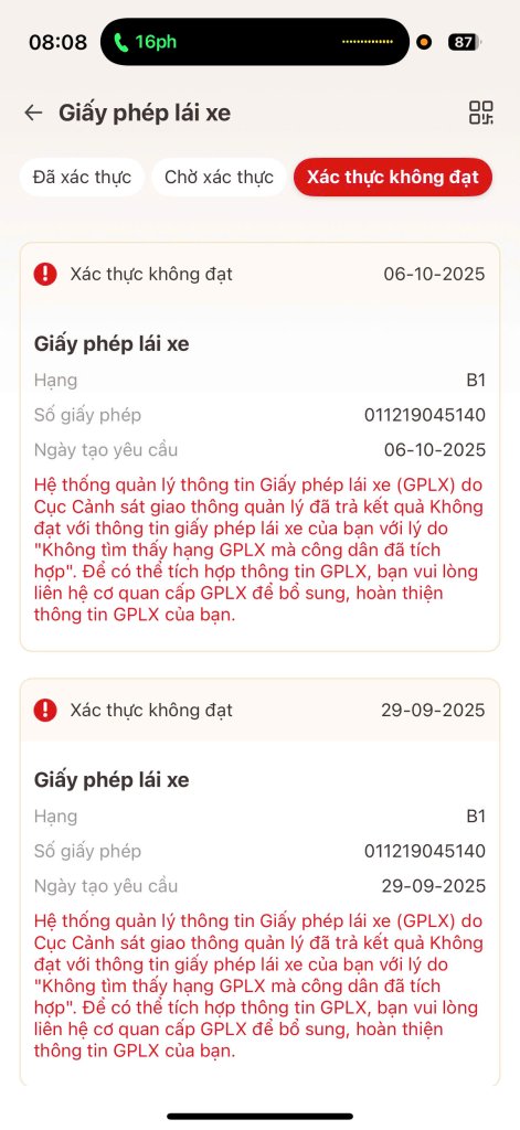Các cụ mợ thông thái cho em hỏi: F1 nhà em thêm GPLX hạng B1 trên VNeid mà nó cứ báo lỗi như này là sao?