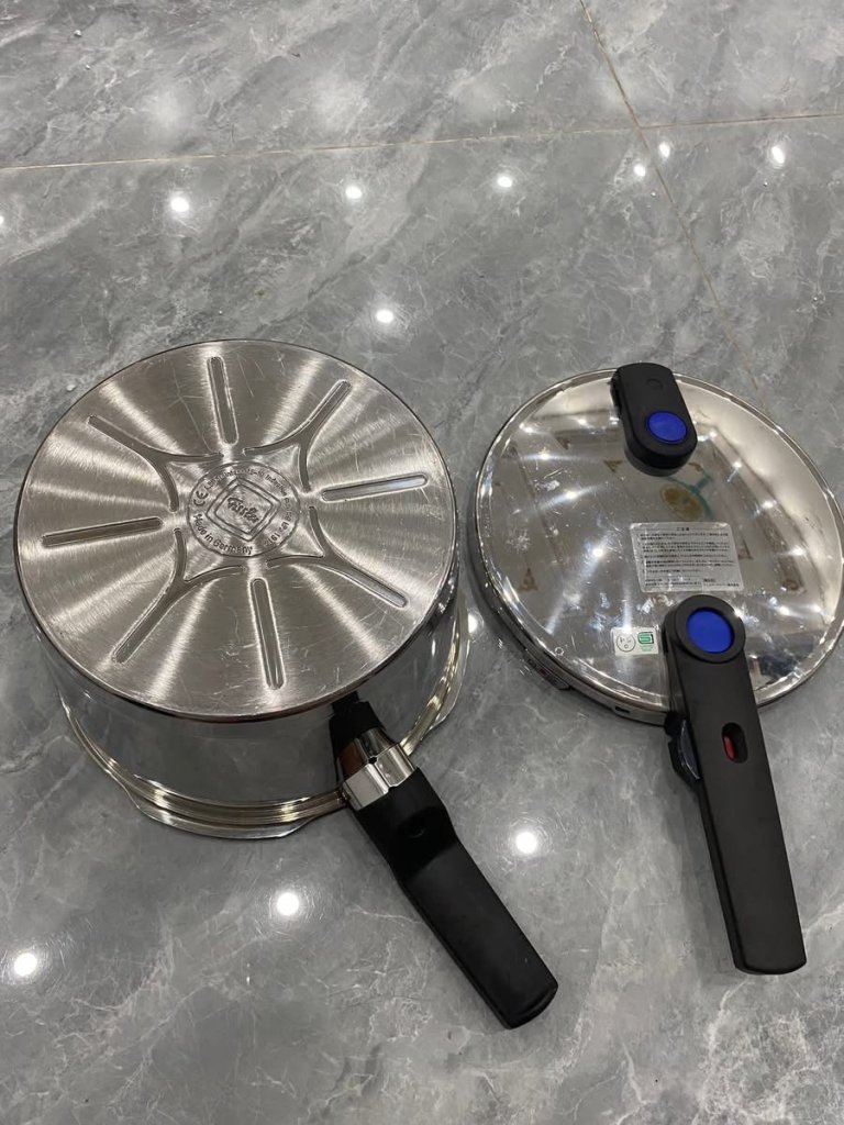 3. Nồi áp suất Fissler Vitaquick 4.5L. Nồi làm bằng inox 18/10 rất dày nặng. Nồi mới dùng vài lần nên như mới. Gioăng cao su còn mới. Đáy nồi cookstar chỉ có ở dòng cao cấp của Fissler. Nồi dùng được bếp từ và các loại bếp khác. Giá: 1,7 triệu