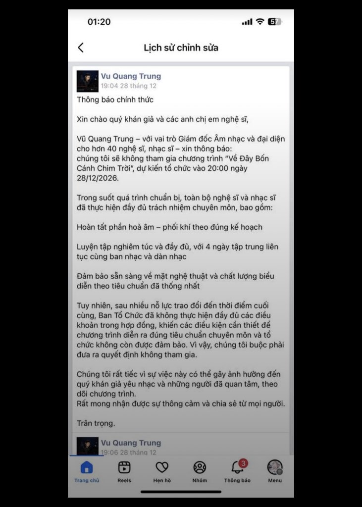 Show bắc buộc phải có rehearsal , show này không rehearsal thì 100% ko thể diễn đc. Nhưng vẫn không thông báo hoãn mà để khán giả đến
