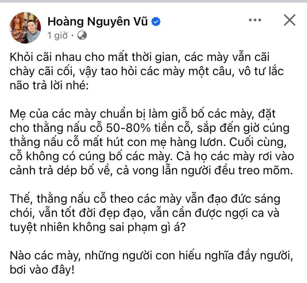 Khi show bị huỷ khiến vài nghìn khán giả bị bỏ rơi, c Hà vướng vòng lao lý mà a vẫn có tâm trạng để lên loạt bài viết để định hướng dư luận kiểu tôn vinh bản thân một cách lố bịch như này, thật sự thấy cái tâm đức của anh có vấn đề quá!“
