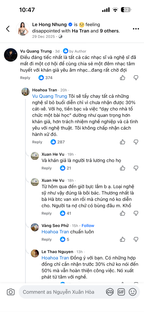 Việc đang nói & gây tranh cãi ở đây là phía bên kia, đối tác của NV là ông GD Âm Nhạc + cộng sự (và các nghệ sĩ) có thật sự vô can và đáng thương như họ lên mạng rêu rao ngay sau khi show bị hoãn (trước khi tin nhắn bị leak) - kiểu như ông GDAN công khai: tiếc vì không được biểu diễn - tiếc vì bao công sức luyện tập, vv... họ đang khóc, đang diễn với khán giả, với xã hội bài "chúng tôi muốn lắm, cố lắm, làm hết sức nhưng không thay đổi được việc huỷ show". Đây là đạo đức giả & đáng khinh. Nếu họ nói với công chúng" vì NV, vì nhà sản xuất không trả tiền đúng hạn, không tuân thủ hợp đồng nên chúng tôi không diễn" thì okie. Không ai trách.