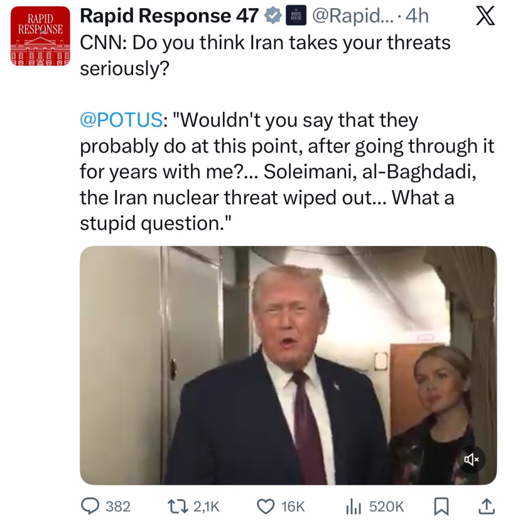 Phóng viên: Iran nói rằng họ sẽ coi các căn cứ quân sự và thương mại là mục tiêu hợp pháp nếu ông tấn công. Ông có lo ngại về điều đó không? Trump: Nếu họ làm vậy, chúng tôi sẽ tấn công họ ở mức độ chưa từng có trước đây. Họ thậm chí sẽ không tin nổi. Tôi có những phương án rất mạnh. Vì vậy, nếu họ làm vậy, chúng tôi sẽ đáp trả bằng một lực lượng rất, rất mạnh.