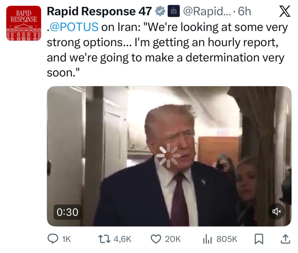 Trump (nói về Iran) : chúng tôi đang xem xét các lựa chọn rất mạnh. Tôi đang nhận báo cáo cập nhật từng giờ (về tình hình Iran). Và tôi sẽ quyết định sớm