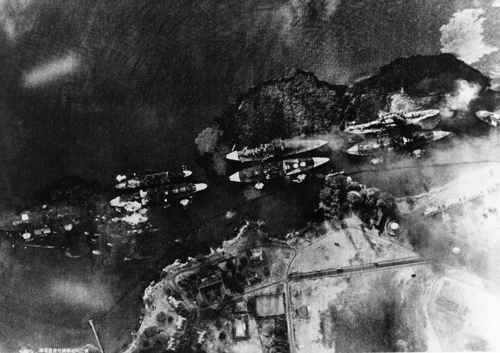 7-12-1941 – hình ảnh do máy bay Nhật Bản chụp dãy tàu chiến Mỹ neo bên cạnh Đảo Ford khi máy bay Nhật Bản ném ném bom ngang vào các tàu neo đậu ở đó.