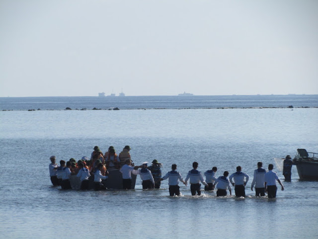 Chia tay nhau, các đồng hương hè nhau bế tọt mình lên xuống và ghé vai đẩy xuồng cùng chiến sĩ, hòa với nhau lời hát: "Đường ra trận mùa này đẹp lắm. Trường Sa Đông nhớ Trường Sa Tây", lấy sức cho đáy xuồng sượt qua cát sạn, đá san hô rơi nhẹ xuống lạch nước sâu ra với con tàu HQ.