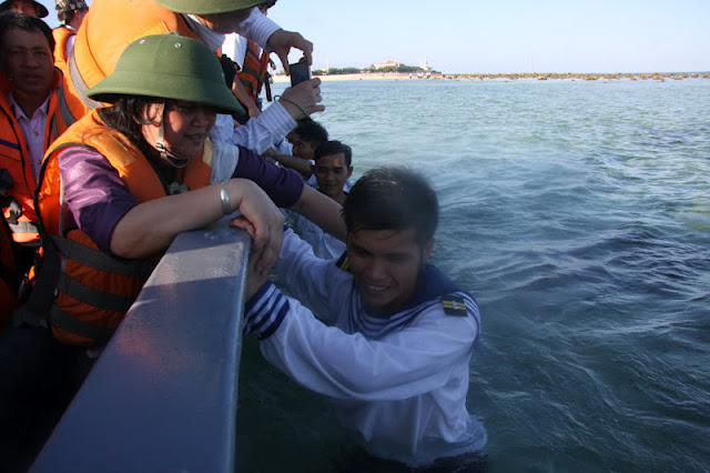 Vẫy tay chào nhau, người ngâm mình dưới nước, kẻ kiễng chân vẫy đến mỏi tay trên xuồng, cứ rưng rưng nhớ lại hình ảnh: Chị Yên Hưng, một nhà khoa học bên Viện Nghiên cứu KHKT Nông nghiệp ra Trường Sa để tìm thuốc, chống sâu hại cây lá - rau cỏ trên đảo, ngồi trên xuồng cứ nắm chặt tay cậu chiến sĩ sinh năm 1992, bằng tuổi con trai, đang gò lưng đẩy xuống dưới biển và thút thít khóc vì thương lính trẻ bé bỏng...