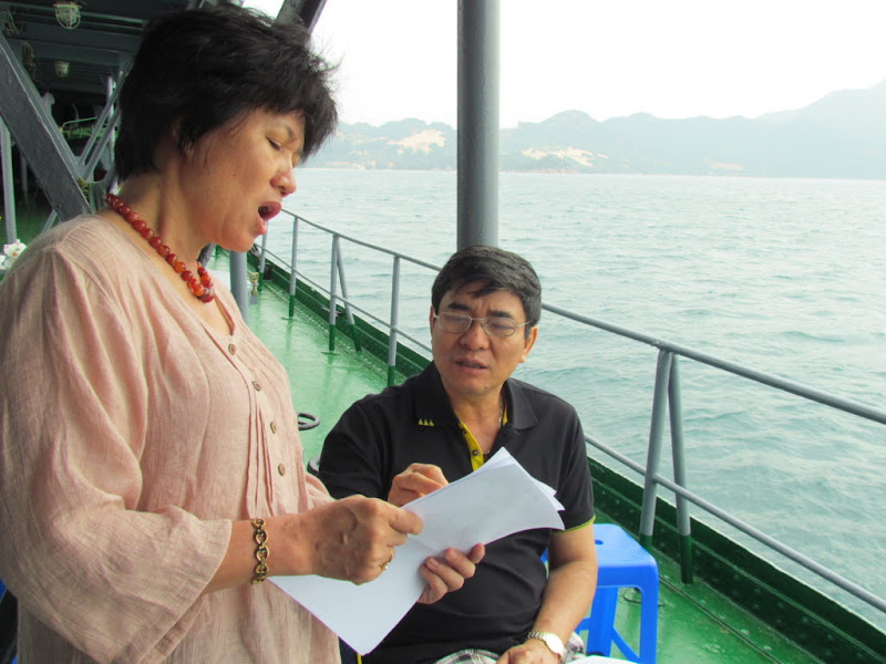 Thế là từ chiều ấy, cả boong trên boong dưới, phòng trong phòng ngoài, đi đâu cũng gặp các thành viên trong Đoàn cúi gằm mặt vào giấy, lẩm nhẩm hoặc rống lên hát, nhạc sai be bét, rất ngộ...