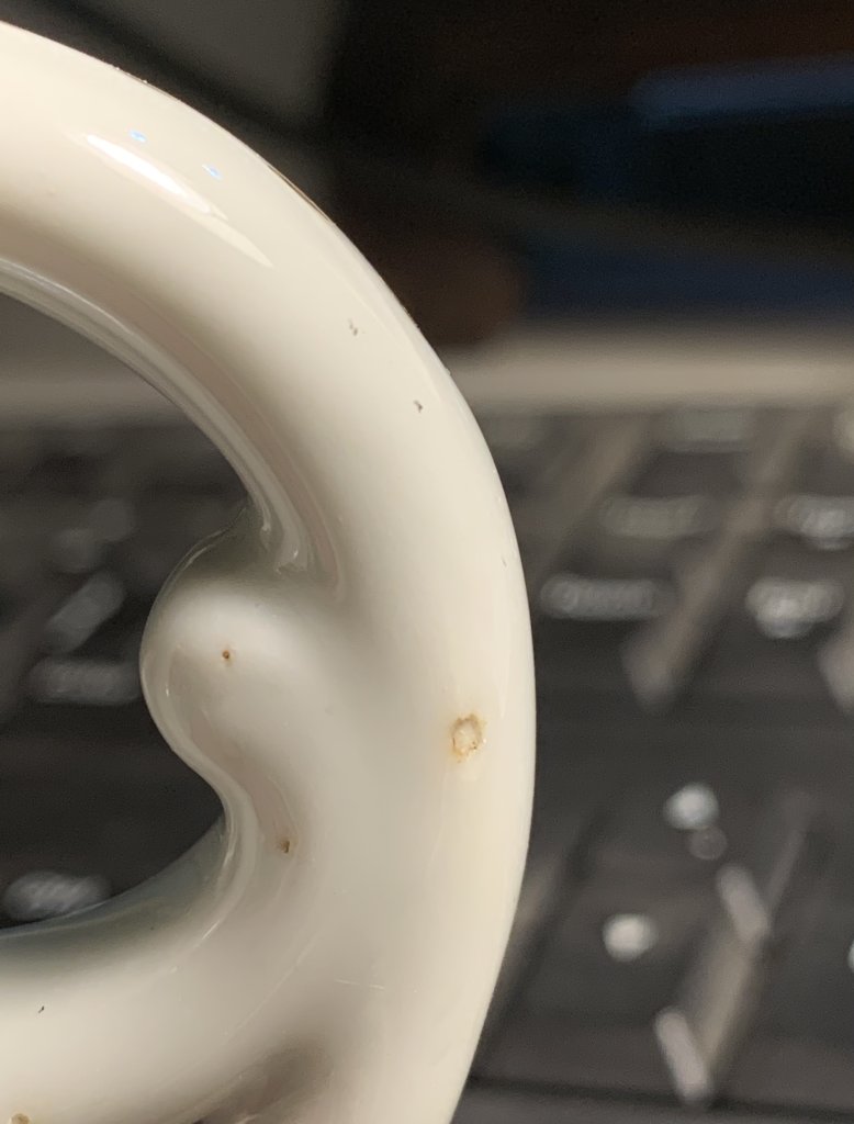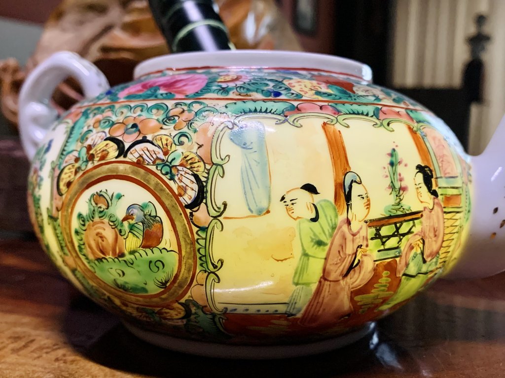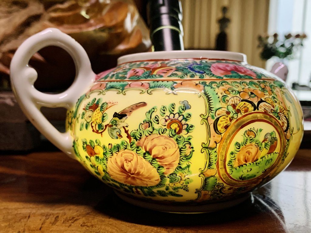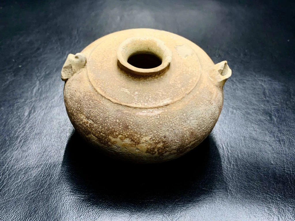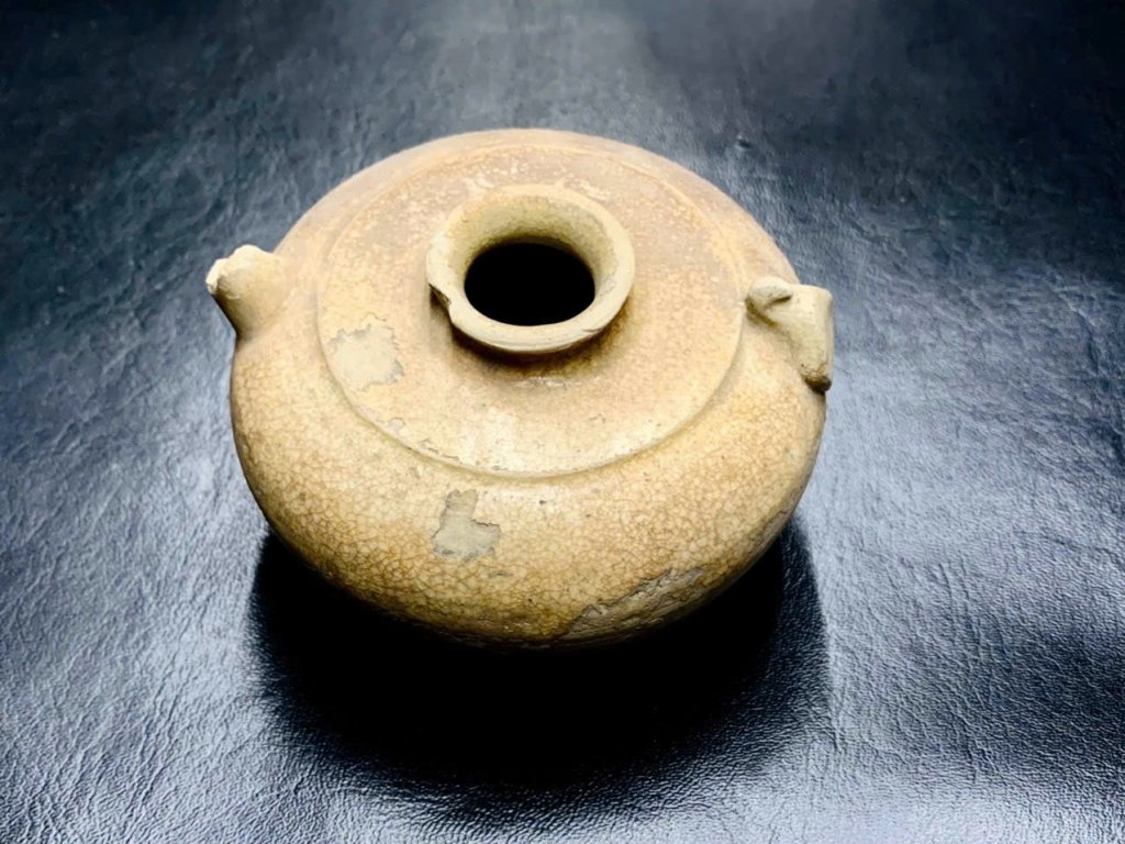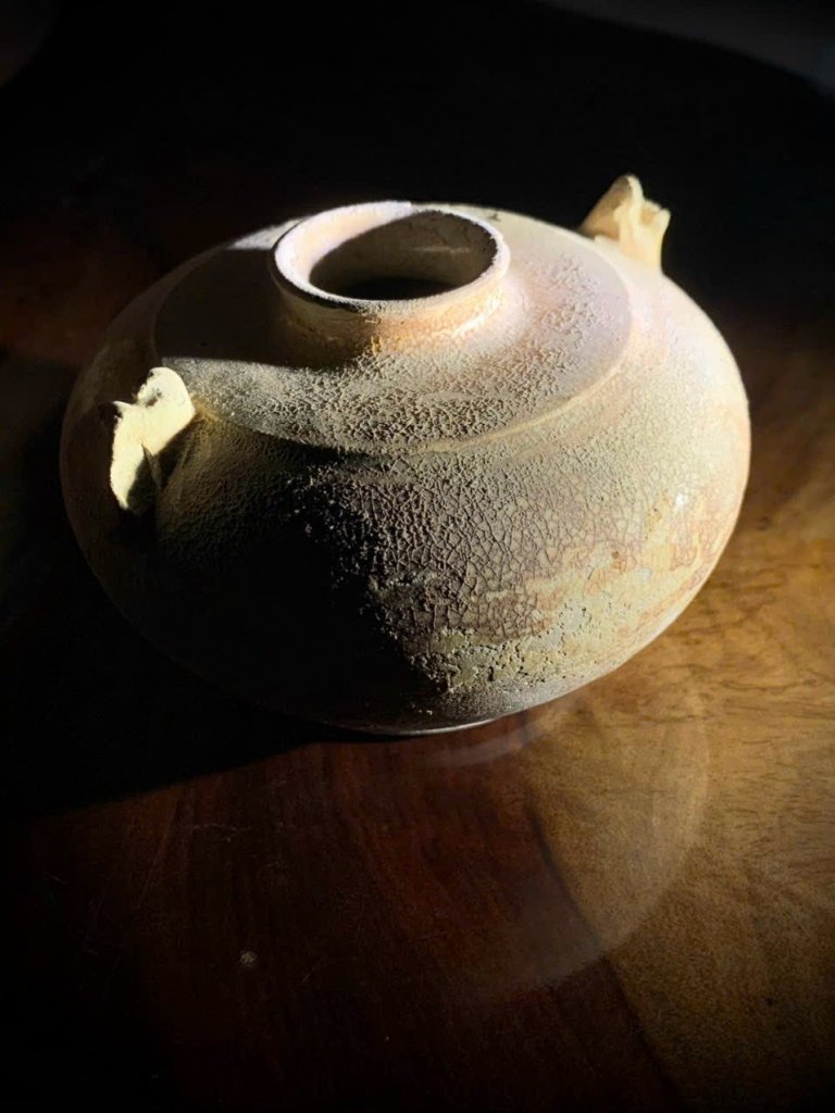 Một chiếc ấm vẹt ngủ, gốm Trần, dáng tối giản nhất nhưng tỷ lệ rất đẹp, nhỏ như quả thị. Ấm này gốm men trắng nhưng nằm trong vùng đất nhiều sắt nên ngả vàng, rạn men.