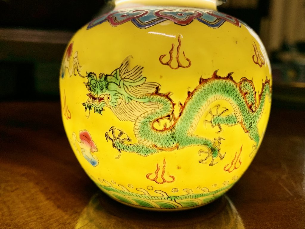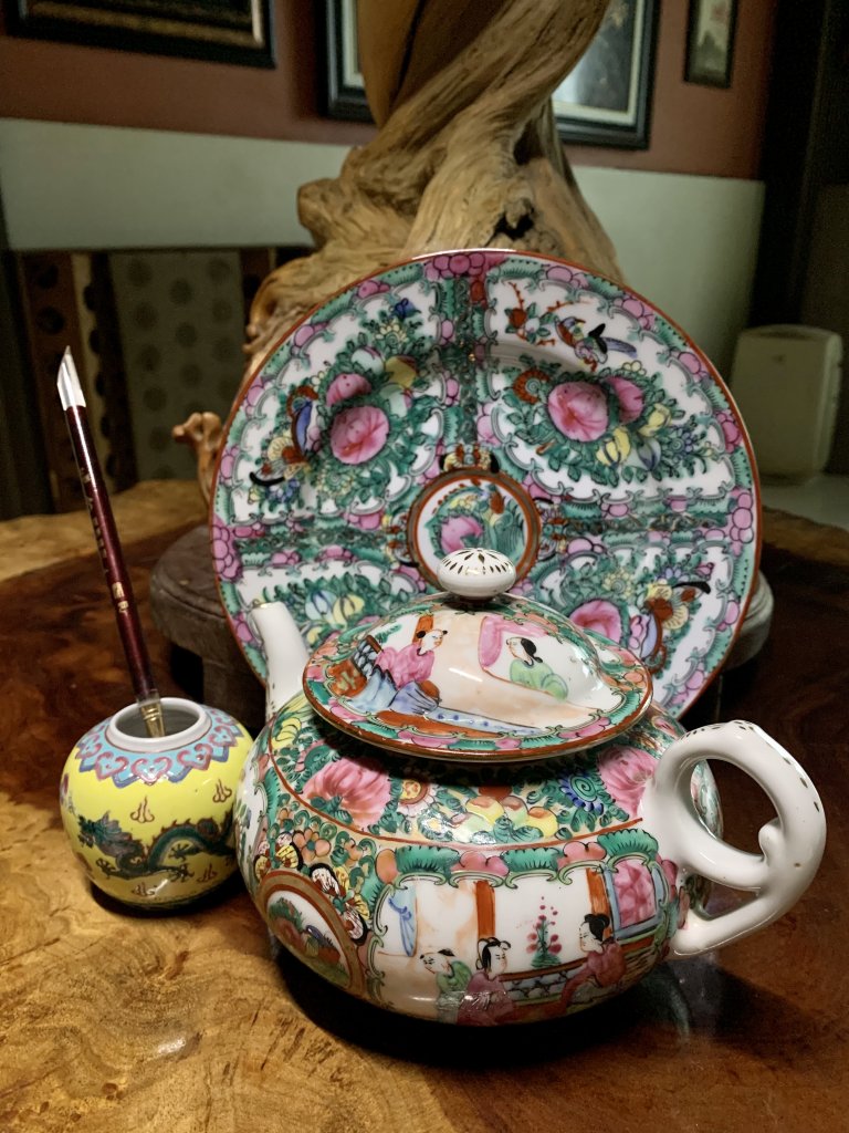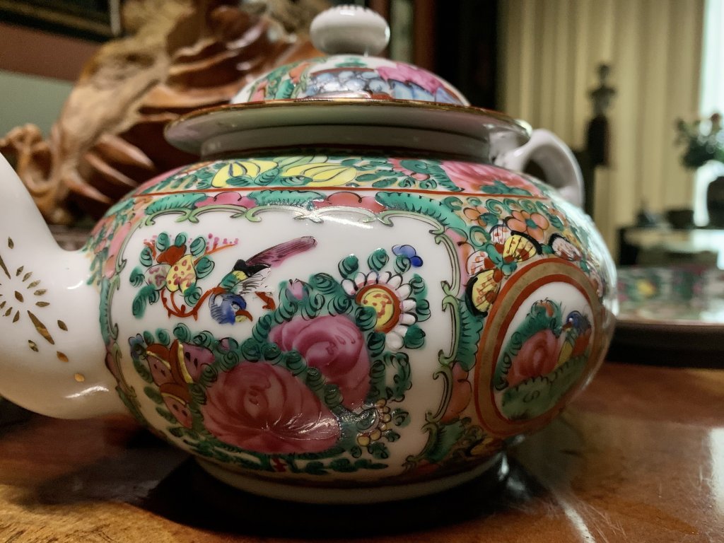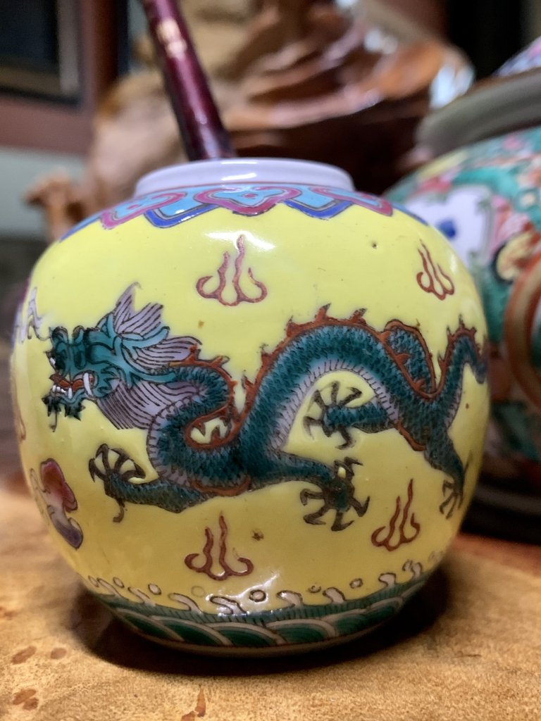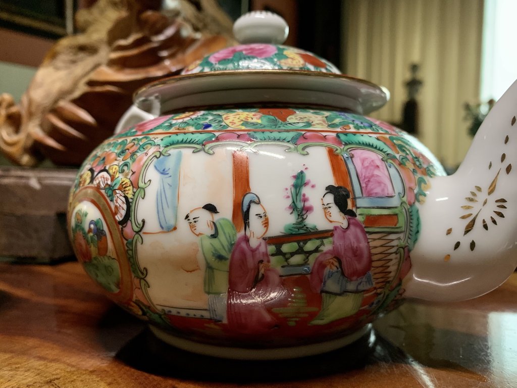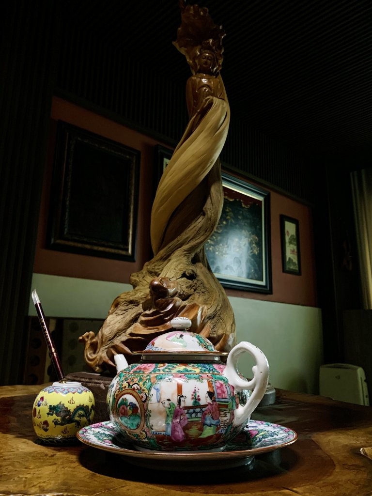 Một chiếc ấm vẹt ngủ, gốm Trần, dáng tối giản nhất nhưng tỷ lệ rất đẹp, nhỏ như quả thị. Ấm này gốm men trắng nhưng nằm trong vùng đất nhiều sắt nên ngả vàng, rạn men.