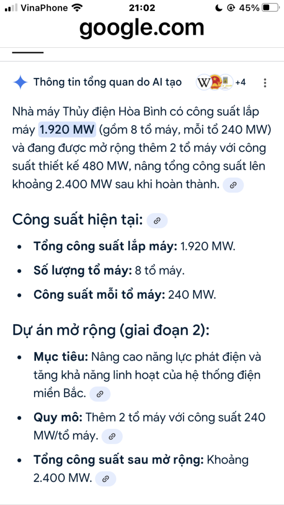 2400MW là Sơn La cụ ạ, Hoà Bình là 1920MW. Còn 2 tổ chạy bổ sung là 480MW nhưng thời gian chạy chỉ đạt vào mùa lũ thôi cụ.Thuỷ điện Hoà Bình 2400 MWh nhé