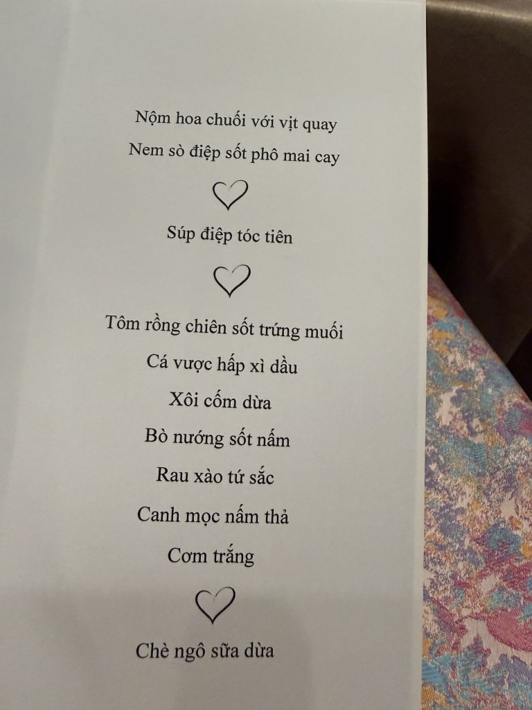 Đúng thế mà cụ anh,em tưởng menu đang để trên bàn.Chỗ mà Kinh Miu tưởng là khăn trải bàn thì chính là cái Gió khoe đấy