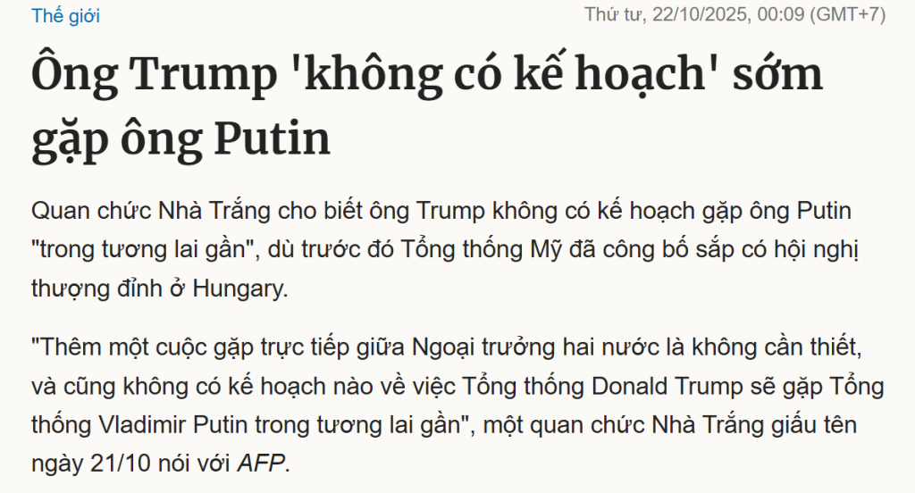 chắc do vụ này...Ngày 18/10, khoảng 7 triệu người trên toàn nước Mỹ đã tham gia các cuộc tuần hành mang tên “No Kings” (Không có Vua) phản đối một số chính sách của Tổng thống Donald Trump và thông điệp chống lại xu hướng tập trung quyền lực vào cá nhân lãnh đạo.