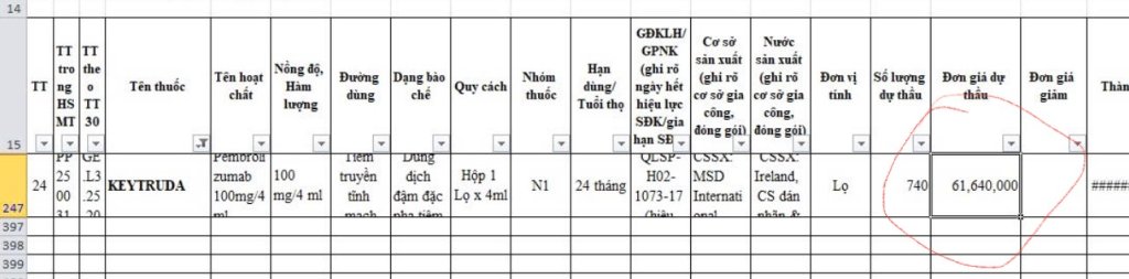 Keytruda giá khoảng 120tr/lọ em ạ, nếu được hỗ trợ theo chương trình mua 1 tặng 1 thì tính chi phí mới còn 60tr/lọ (đây là giá cách đây 4 năm, còn bây giờ chị ko rõ).