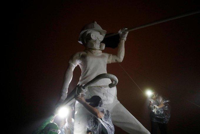 Tượng 'Nữ thần Tự do' xì tai Hồng Tân được bê đi diễu hành. =))