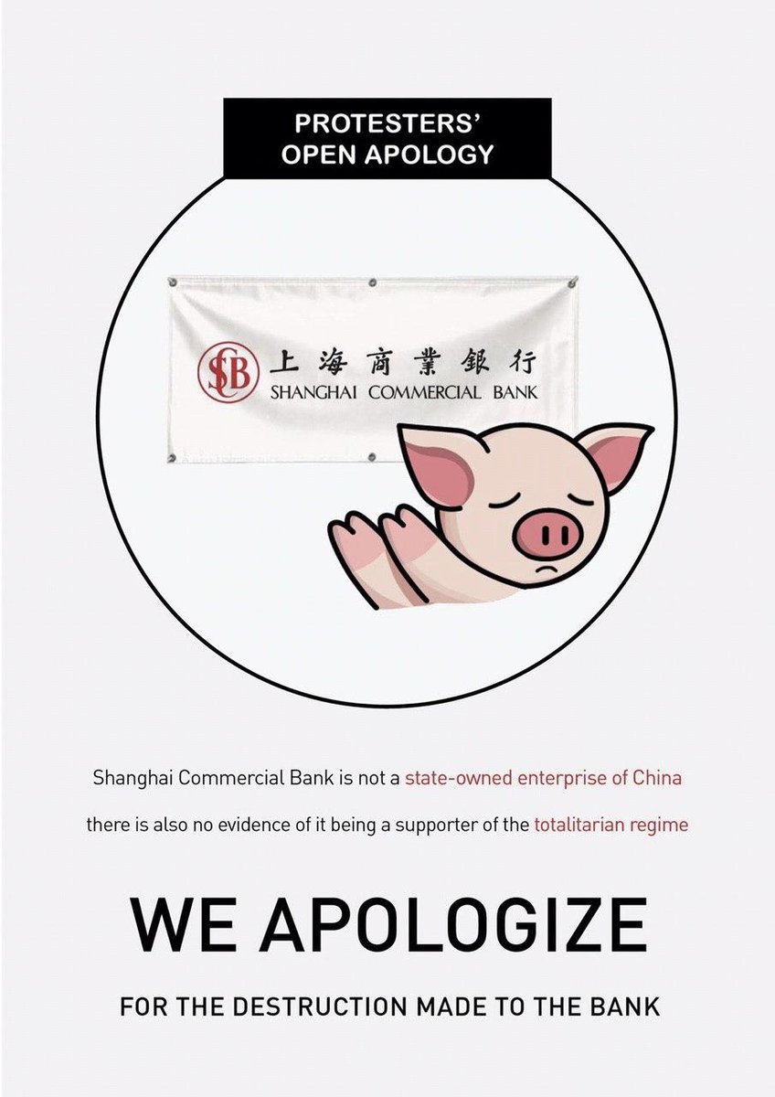 [PROTESTERS OPEN APOLOGY] Shanghai Commercial Bank is NOT a state-owned enterprise of China. There is also no evidence of it being a supporter of the totalitarian regime. We apologize for the destruction made to the bank.