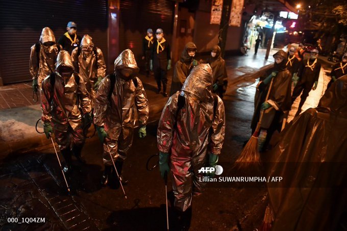 Bộ đội Hoàng gia Thái Lan phun thuốc khử trùng trước các địa điểm giải trí buộc phải đóng cửa trên đường Rambuttri ở Bangkok.