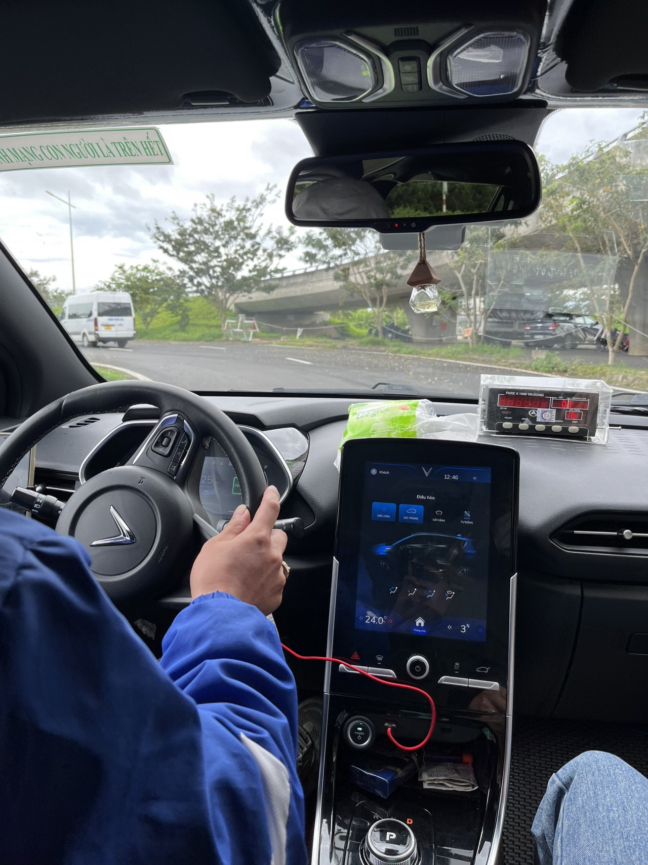 Sau khi “đo đạc” chán chê không gian hàng ghế sau của VF e34, em bắt đầu ngắm anh tài ít nói. Anh tài lái xe bình tĩnh, thi thoảng trả lời cuộc điện đàm của tổng đài. Khi anh thao tác trên bảng điều khiển, em thấy mọi thứ rất nhanh và nuột. Nếu quen nhìn các bác tài điều khiển xe xăng truyền thống, khi sang bên này em thấy có vẻ nhàn hơn (đây là cảm nhận cá nhân của em). Nhưng anh tài ít nói nên em không có cơ hội được nghe anh ra lệnh Hey VinFast, và cũng không được nghe trợ lý ảo trả lời lại.