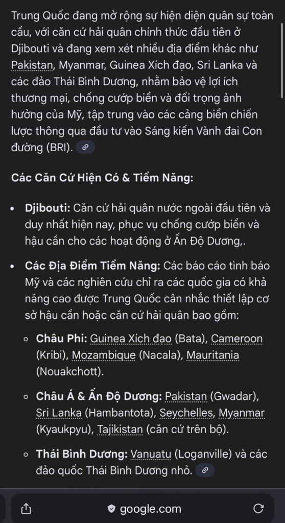 Nói như cụ cũng k hẳn đúngTQ có đi ban phát dân chủ đâu mà cần phải nhiều căn cứ quân sự trên khắp thế giới
