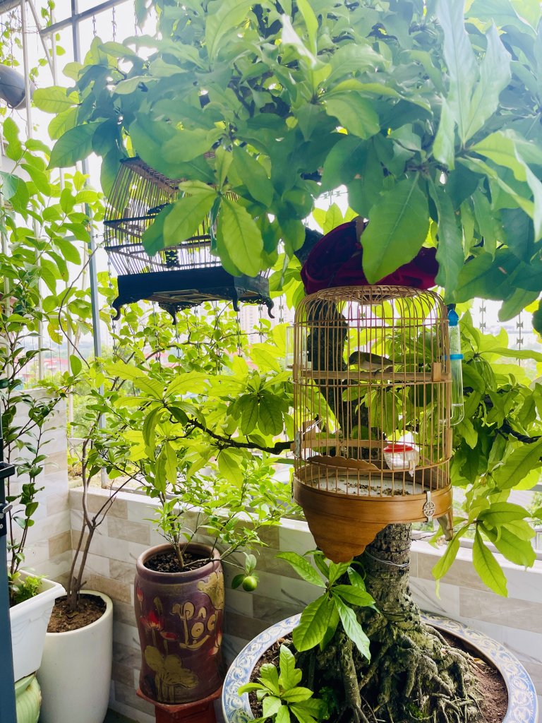 Cuối tuần, ăn sáng xong em làm ly cafe vào vườn ngắm hoa.
