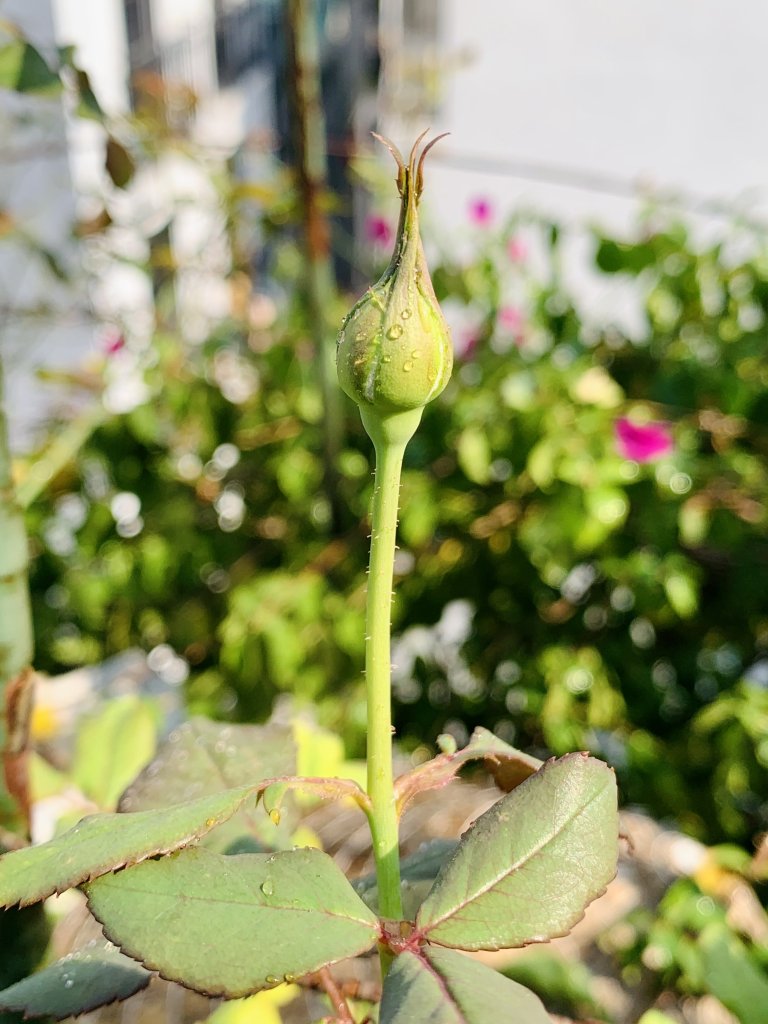Nắng chiều đẹp, em cũng xuống vườn uốn ít cành hoa hồng để kéo nó thấp xuống men theo hàng rào. Bọn này bật cành cao vống hết cả lên thì sao mà chụp ảnh cho nổi :P