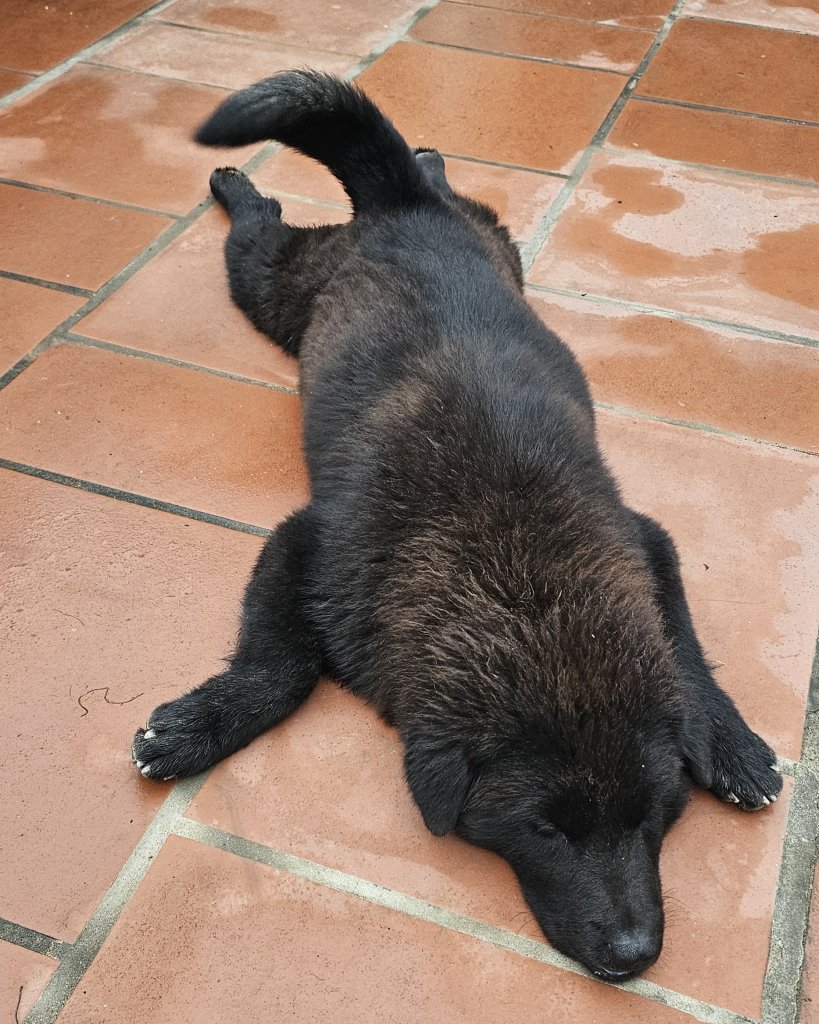 Con đen này nhà em có mẹ Phú Quốc di truyền sống lưng dựng lên, bố Lạp xưởng chân ngắn ngủn tai dày cụp thân dài ngoằng, ra F1 là nó nhìn rất tếu ạ