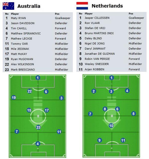 Tối nay 23h trận đấu bảng B giữa Hà Lan-Úc, sau trận mở màn Úc chưa có điểm nên trận này họ rất cần 3 điếm để vào vòng 1/16. Tuy nhiên đối đầu với Hà Lan lúc này có vẻ là thử thách lớn khi trận mở màn HL đã cho nhà vô địch WC2010 trắng bụng với tỉ số 5-1. HLV Van Gaal nói chúng tôi vẫn đang ở dưới mặt đất chứ không phải đang bay bổng ở trên trời nên HL cũng cần 3 điểm củng cố ngôi đầu bảng B, rất có thể họ chỉ gặp Mexico chứ không phải là Brazil vòng 1/16.