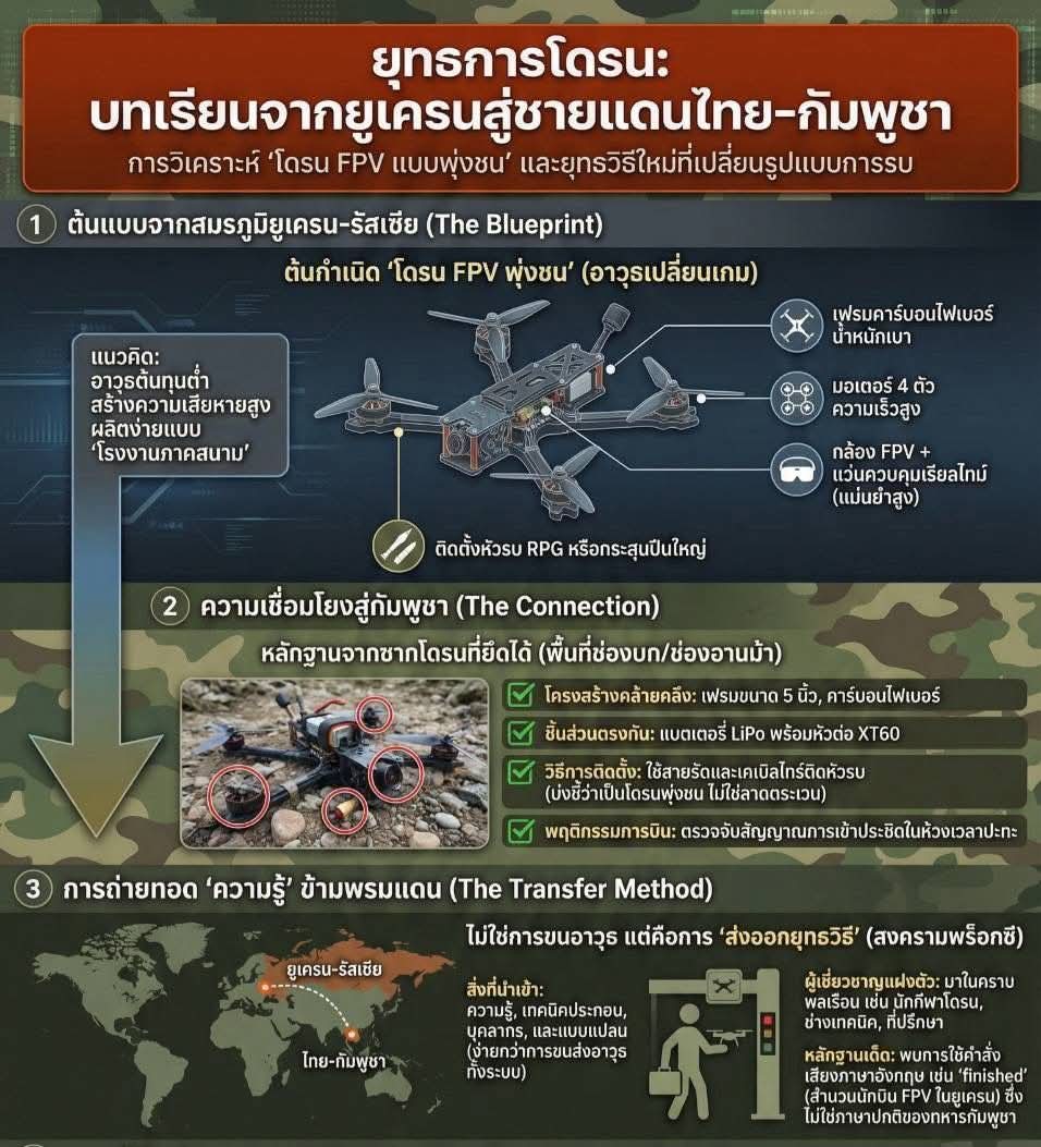 Như vậy, trong cuộc chiến này, Cam cũng đã âm thầm chuẩn bị cho mình nhiều quân bài- Không biết đội nào đã huấn luyện, lắp ráp FPV mà quân Cam đang sử dụng có cả cáp quang và rất hiệu quả trên chiến trường, Thái đã rút lui khỏi một số vị trí chiếm đóng sau khi bị quân Cam tấn công.