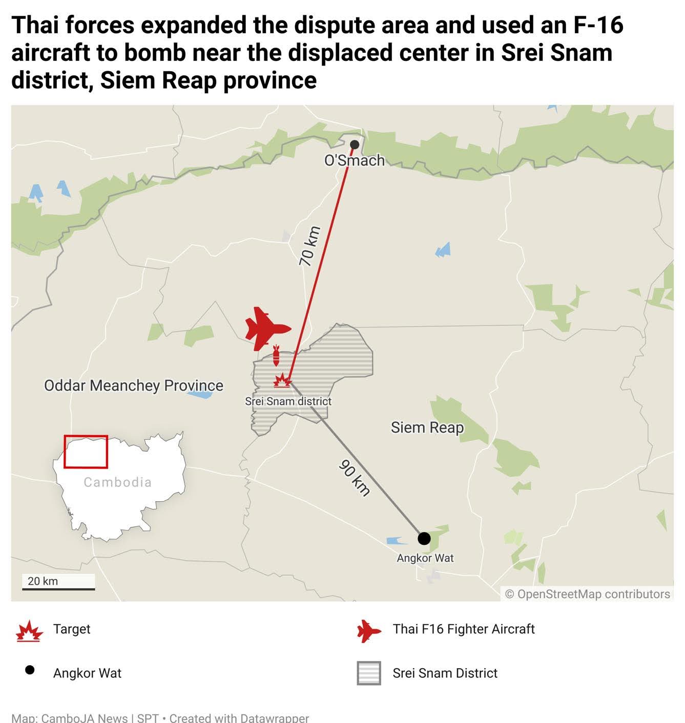 Do Không quân của Cam ko có ; phòng không thì kém cụ ạ , Nên máy bay Thái bay ra bay vào như đi chợMột máy bay chiến đấu đa năng F-16A/B của Không quân Hoàng gia Thái Lan (RTAF) đã tấn công các vị trí của quân đội Campuchia sâu bên trong huyện Thmor Puok, tỉnh Banteay Meanchey, Campuchia.